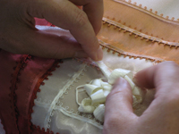 手順2、地布に縫いつけたリボンの中心にブランケットステッチを施します。