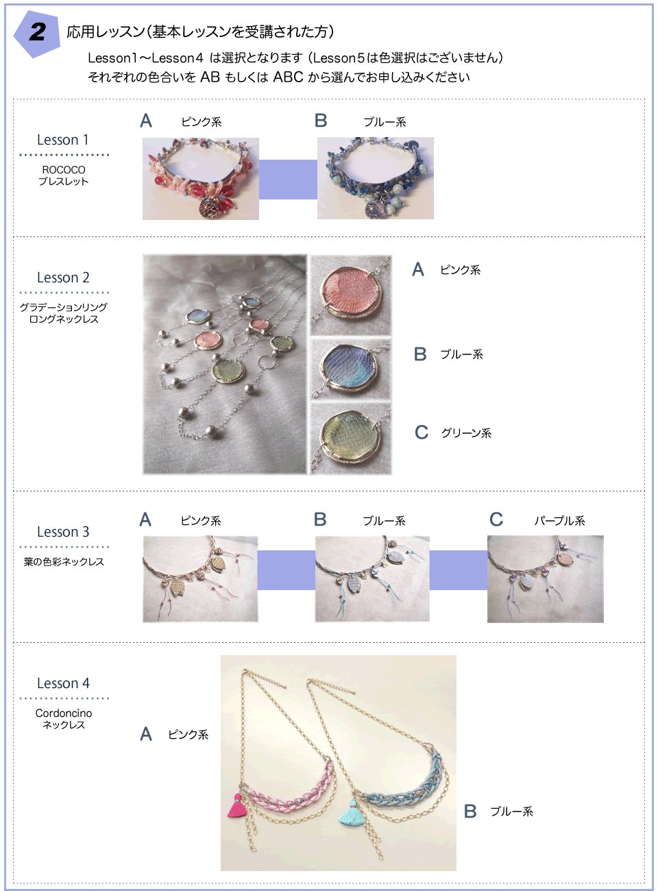 基本レッスンと応用レッスンはお申し込みの際に色をお選び頂いております。こちらのページを参考になさってください。 応用レッスンの色選択はこちら